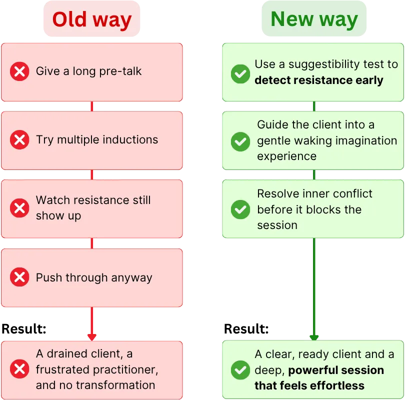 Most resources focus on inductions and deepening techniques. But this method gives you a practical way to address resistance before trance even begins, without pushing, forcing, or trying to outsmart your client. It feels simple, gentle, effective, and our students love that it actually works.